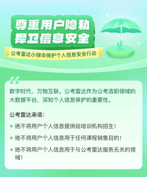 作为公考选职领域的大数据平台,“公考雷达”始终将用户信息安全与数据保护置于核心位置。公开发起的“小绿伞”行动做出郑重承诺,履行“三不”宣言!